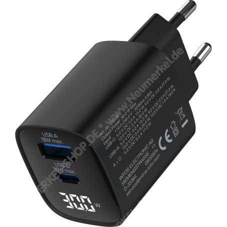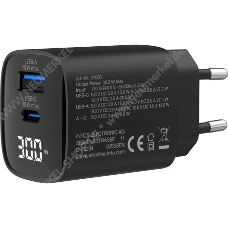 InLine USB PD Netzteil, GaN Ladegerät, 2-Port, USB-C + USB-A, 30W, mit Display