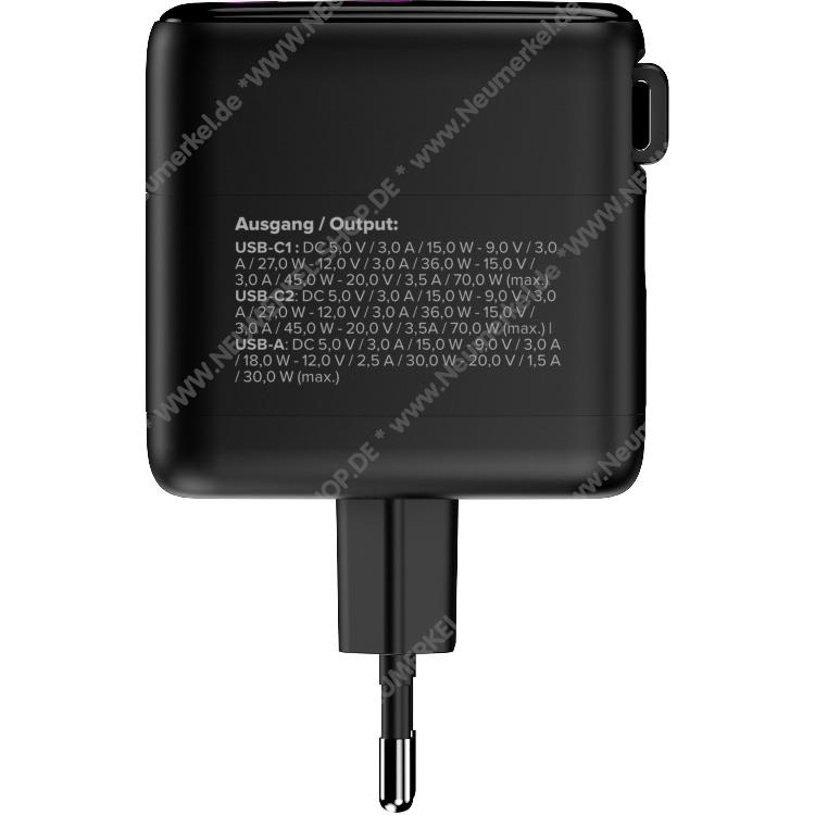 - USB-C2 Ausgang: DC 5,0 V / 3,0 A / 15,0 W - 9,0 V / 3,0 A / 27,0 W - 12,0 V / 3,0 A / 36,0 W - 15,0 V / 3,0 A / 45,0 W - 20,0 V / 3,5A / 70,0 W (max.)