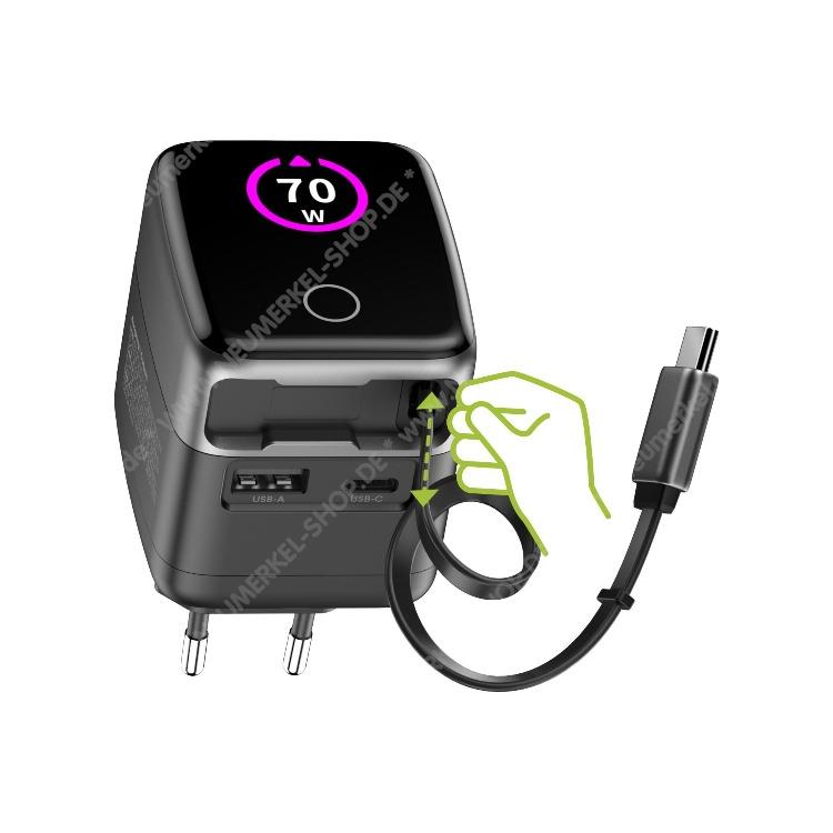 Mit zwei leistungsfähigen USB-C-Anschlüssen mit Power Delivery (PD) und einem zusätzlichen USB-A-Anschluss mit Quick Charge (QC) lassen sich nahezu alle mobilen Geräte - vom Smartphone bis zum Notebook - gleichzeitig und schnell aufladen. Das integrierte, 60 cm lange USB-C-Kabel lässt sich bei Bedarf ausziehen und wieder sauber einrollen, was das Netzteil besonders für mobile Arbeitsplätze und Techniker im Außendienst attraktiv macht.